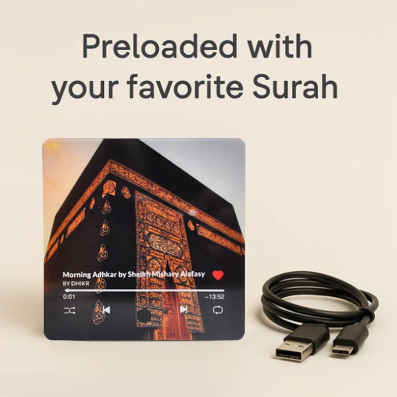Selected Quran verses are pre-loaded into the device, allowing users to listen to beautiful recitations anytime.